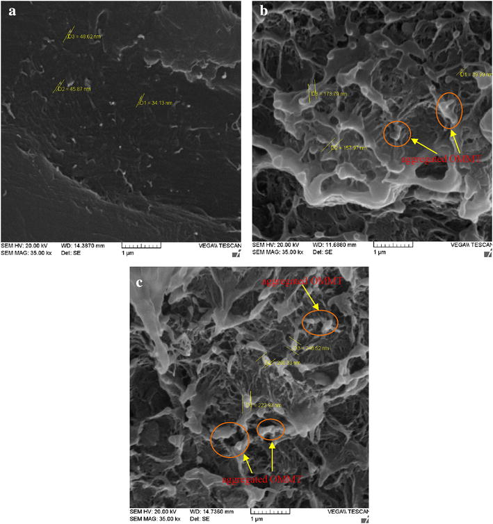 SEM micrographs of the nanocomposites fractured surfaces: a 2 phc OMMT, b 3 phc OMMT, c 5 phc OMMT