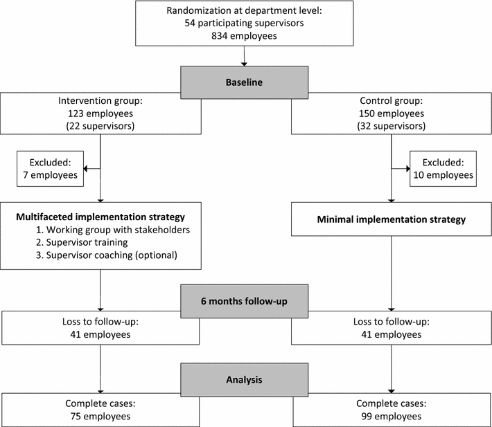 Employees were eligible for participation if they had a minimum age of 18 years. Employees who had a different supervisor at 6 months’ follow-up compared to baseline were excluded from the analyses.
