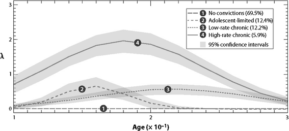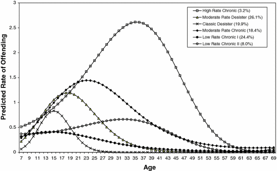 Physical Aggression Trajectory Group Criminal Career Violent Delinquency Rate ChronicNearly two decades have passed since the publication of “Age, Criminal Careers, and Population Heterogeneity: Specification and Estimation of a Nonparametric Mixed Poisson Model” by Nagin and Land (1993). In that article Nagin and Land laid out a statistical method that has come to be called group-based trajectory modeling. The principle objective of the paper was to address issues related to the “hot topic” of the time—the criminal career debate—not to lay out a new statistical methodology. As described in the paper’s abstract, these issues were: “First, is the life course of individual offending patterns marked by distinctive periods of quiescence? Second, at the level of the individual, do offending rates vary systematically with age? In particular, is the age-crime curve single peaked or flat? Third, are chronic offenders different from less active offenders? Do offenders themselves differ in systematic ways?”