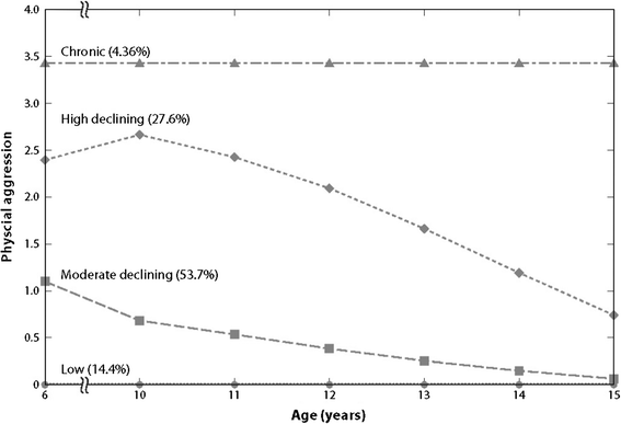 These trajectories are notable both for what is present and what is not present. As for what is present, all of the trajectories are stable or declining from age 6 on. Thus, over the period from age 6 to 15 there is no evidence of rising physical aggression even among a small sub-population in these data. As for what is not present, we see no evidence of late onset-like trajectories of physical aggression, namely a trajectory that rises from a zero or negligible level at some point between 6 and 15. Because the trajectories are at their highest at age 6, this suggests that to understand the developmental origins of physical aggression in these boys we need to look back in time prior to age 6 rather than forward in time into their adolescence. Indeed much research confirms this supposition (Tremblay 2010). While developmental psychologists have long observed elevated mean levels of aggression in early childhood, trajectory modeling has provided a tool for showcasing the developmental trends in aggression over time for both the entire population and for key subgroups of children. The absence of late onset-type trajectories of physical aggression is not unique to these Montreal males. A follow-up analysis of five additional prospective longitudinal studies—one more from Canada, two from New Zealand, and two from the US—again found no evidence of the onset of physical aggression after age 6 (Broidy et al. 2003). Arguably, the application of GBTMs has helped to extend theorizing about the age-crime (or age-aggression curve) beyond the typical age period relied on by criminologists, who are working primarily with official arrest records that by design censor childhood behaviors.