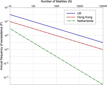 - Group risk has been defined as the relationship between frequency and the number of people suffering from a specified level of harm in a given population from the realization of specified hazards (IChemE 1985). Group risk is often represented through an FN-curve, which gives the annual frequency of exceedance as a function of the number of fatalities, on a log–log scale. These curves can then be compared with international standards, which define thresholds to the FN-curves (see Fig. 2).Fig. 2