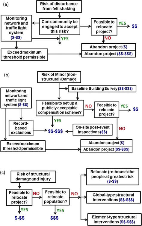 Flowcharts indicating suggested options for managing risks of a felt shaking causing annoyance, b non-structural damage incurring repair costs, and c structural damage that could threaten life and limb. In each case, range of possible costs associated with each alternative are indicated ($: low; $$: medium: $$$: high)