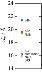 Effects of monovalent and monatomic salts on lamellar repeat distances d of nonionic surfactants (monomyristolein and \({\mathrm {C_{12}E_{2}}}\)) are investigated using small-angle X-ray diffraction. The lamellar repeat distances (sum of thicknesses of a bilayer and a sandwiched water layer) increase with increasing salt concentration with a strong anion dependence (Br\(^->\) Cl\(^- \)). The increase of the thickness of the water layer is found to dominate the increase in d. Since the anion dependence is inconsistent with the ion dependence of the strength of the primary hydration, we reported previously (Hishida et al. J Chem Phys 142:171101, 2015), the hydration force classically considered is not the origin of the increase in d. This means the increase in d cannot be explained by the existing model of the forces between neutrally charged bilayers. The temperature dependence of d also supports the necessity for a new mechanism of the effect of ions. The new mechanism seems to be related to the water structure beyond the primary hydration water, i.e., the secondary hydration water, which depends on the ion species.