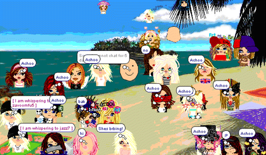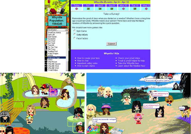 Gallery of different Whyville screen shots (clockwise): Welcome screen, Chatting at the Beach, and Playground.