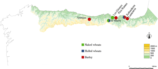 In northern Spain, several determinations of cereal pollen—which must be viewed with caution due to the impossibility of absolute discrimination of pollen from wild grasses and cereals (Behre 2007)—have been made at various sites from the second half of the sixth millennium onwards: O Reiro (La Coruña) (López-Sáez et al. 2010) and other peat bogs in Galicia and Asturias (López-Merino et al. 2010), and at the archaeological sites of Los Gitanos (Cantabria) (Ontañón-Peredo et al. 2013) and Herriko Barra (Basque Country) (Iriarte et al. 2005). However, incontestable evidence for the first domestic crops in the Cantabrian region, as provided by plant macroremains, is scant and comes from just four sites with charred preservation of plant remains and layers dated from the middle of the fifth millennium onwards (Kobaederra, Pico Ramos and Lumentxa in Biscay, and El Mirón in Cantabria) (Zapata 2002; Zapata et al. 2004; Peña-Chocarro et al. 2005a; Zapata et al. 2007). The scarcity of contexts dated to the sixth millennium might be behind this apparent delay in the introduction of agriculture (Zapata et al. 2007). If reliable dates for early Neolithic contexts in the Cantabrian region are in general very scarce (see above), they are even scarcer for sites with non-woody plant macroremains. To put it in another way, of those few early Neolithic sites with certain dates, only a few, namely Pico Ramos, El Mirón, and Kobaederra (Peña-Chocarro et al. 2005b; Zapata 2002; Zapata et al. 2007) have had archaeobotanical sampling and analyses carried out.