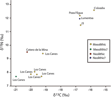 Despite the increase in palaeoeconomic information, it is still difficult to calculate the relative contribution of each food type to the diet, especially when, due to taphonomic biases, some subsistence practices, such as gathering wild fruits, must be under-represented in the archaeological record, whereas others, such as shellfish gathering, are probably over-represented. However, some stable isotope data (δ13C and δ15N) obtained from the collagen of several human remains in the regions (Arias 2005) reflect similar amounts of terrestrial and marine protein in the diet. (It should be noted that palaeodietary data from sites in Navarra to the east and León to the west [e.g. Aizpea: Zapata 2000; La Braña: Arias and Schulting 2010] are not included as relevant comparators here due to the fundamentally different nature of these inland environments.)