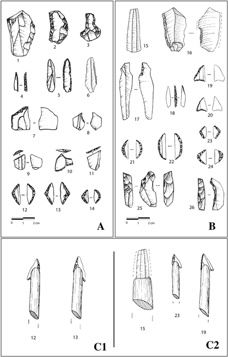 It has often been pointed out that lithic, bone and antler hunting implements are very scarce at Asturian deposits (Arias and Fano 2009; Fano 2004; González-Morales 1982). The improbability of their appearance in shell-middens, and the use of perishable raw materials (such as wood) are often put forward as explanations for this scarcity. Indeed, the contrast between Asturian tool kits, characterised by implements made from cobble-stones, and those from other Mesolithic sites in the region, where geometric microliths occur, is noteworthy. However, new finds, such as the ensemble of lithic armatures (circle segments, triangles, trapezia, etc.) at El Mazo are helping to reduce this contrast (Gutiérrez-Zugasti et al. 2014; Arias and Fano 2009).