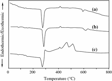 The endothermic peak resulting from the thermal decomposition of NH4NO3, which was the first reaction under a nitrogen atmosphere, appeared between 266 and 305 °C, and a weak exothermic reaction then took place at around 400 °C followed by an endothermic reaction at 578 °C. Also, in air, an endothermic reaction was observed at 277 °C, an exothermic reaction around 400 °C, and two endothermic reactions at around 598 °C. Under a hydrogen atmosphere, one endothermic reaction was observed at 270 °C, and three exothermic reactions were then observed at around 400, 441, and 590 °C.
