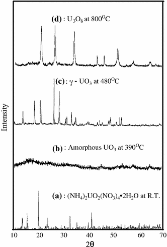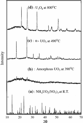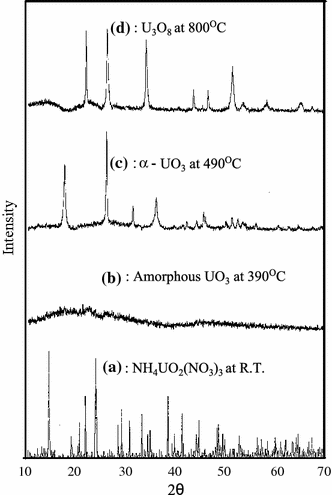 \( {\text{NH}}_{ 4} {\text{UO}}_{ 2} \left( {{\text{NO}}_{ 3} } \right)_{ 3} \to {\text{A-UO}}_{ 3} \to \alpha {\text{-UO}}_{ 3} \to {\text{U}}_{ 3} {\text{O}}_{ 8} \)