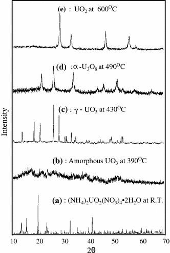 \( {\text{NH}}_{ 4} {\text{UO}}_{ 2} \left( {{\text{NO}}_{ 3} } \right)_{ 3} \to {\text{A-UO}}_{ 3} \to \beta {\text{-UO}}_{ 3} \to \alpha {\text{-U}}_{ 3} {\text{O}}_{ 8} \to {\text{UO}}_{ 2} \)