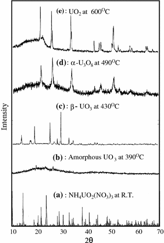 | Current study | \( \begin{aligned} & \left( {{\text{NH}}_{ 4} } \right)_{ 2} {\text{UO}}_{ 2} \left( {{\text{NO}}_{ 3} } \right)_{ 4} \cdot 2 {\text{H}}_{ 2} {\text{O}} \to \left( {{\text{NH}}_{ 4} } \right)_{ 2} {\text{UO}}_{ 2} \left( {{\text{NO}}_{ 3} } \right)_{ 4} \cdot {\text{H}}_{ 2} {\text{O}}\\ & \to \left( {{\text{NH}}_{ 4} } \right)_{ 2} {\text{UO}}_{ 2} \left( {{\text{NO}}_{ 3} } \right)_{ 4} \to {\text{NH}}_{ 4} {\text{UO}}_{ 2} \left( {{\text{NO}}_{ 3} } \right)_{ 3} \to {\text{A-UO}}_{ 3}\\ & \to \gamma {\text{-UO}}_{ 3} \to {\text{U}}_{ 3} {\text{O}}_{ 8}\\ & {\text{NH}}_{ 4} {\text{UO}}_{ 2} \left( {{\text{NO}}_{ 3} } \right)_{ 3} \to {\text{A-UO}}_{ 3} \to \alpha {\text{-UO}}_{ 3} \to {\text{U}}_{ 3} {\text{O}}_{ 8} \\ \end{aligned} \) | N2 |