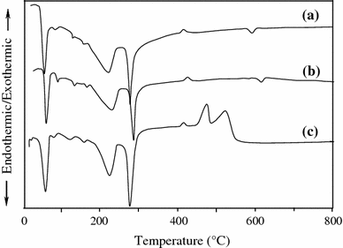 DTA curves for (NH4)2UO2(NO3)4·2H2O in a N2, b Air, and c H2 atmosphere