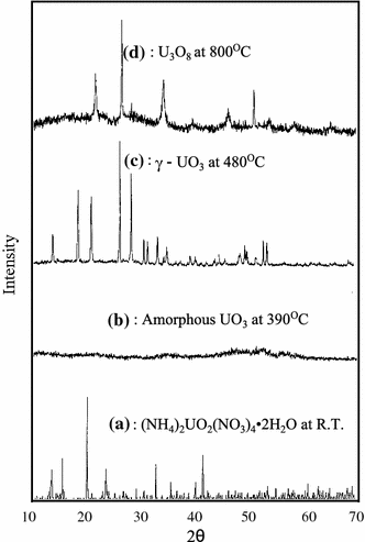 | Sato [13] | \( {\text{AU}} \to {\text{UO}}_{ 3} {\text{NH}}_{ 3} \to {\text{A-UO}}_{ 3} \to \beta {\text{-UO}}_{ 3} \to {\text{U}}_{ 3} {\text{O}}_{ 8} \) | Air |