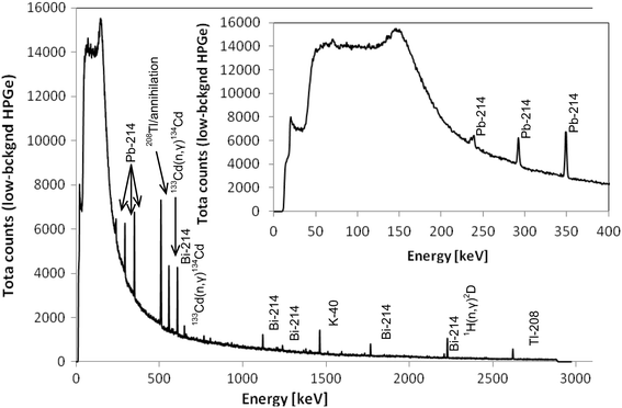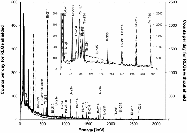 The origin of gamma-ray background spectrum is complex. In the case of the studied conditions one can distinguish among several sources of gamma-ray emitters. The first one is due the gamma emitters from the salt. The second one is connected with radon daughters present in the air inside the cavern. The third one is due to the radionuclides present inside the detector crystal, cryostat, preamplifiers etc. The use of any kind of external detector’s shielding reduces the first two components (coming from the outside of the spectrometer system), whereas the third one remains. Moreover, the shield introduces the fourth component to the background signal—the background caused by radionuclides inherent to the shield itself.