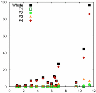 The SS load was evaluated in the following manner for each sampling period. In the following, the notation i (1, 2, 3, or 4) denotes the size fraction of F1, F2, F3 or F4. First, a nominal SS load from a time-integral collection was evaluated (Step 1). Next, a correction factor for the underestimation associated with the time-integrated method was elucidated using the turbidity record (Step 2). Finally, the probable load expected from flow-weighted collection was evaluated (Step 3). Values of the correction factor are listed in Table 2.