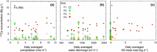where a i is the amount of radioactivity in SS of size fraction i (Bq), c i is the radioactivity concentration in SS of size fraction i (Bq g−1), A is the total amount of radioactivity in SS (Bq), af i is the fractional percent of a i by size fraction (%), al SS, i is the radioactivity transport load with SS for size i (Bq days−1) and AL SS is the total radioactivity transport load with SS (Bq dats−1).
