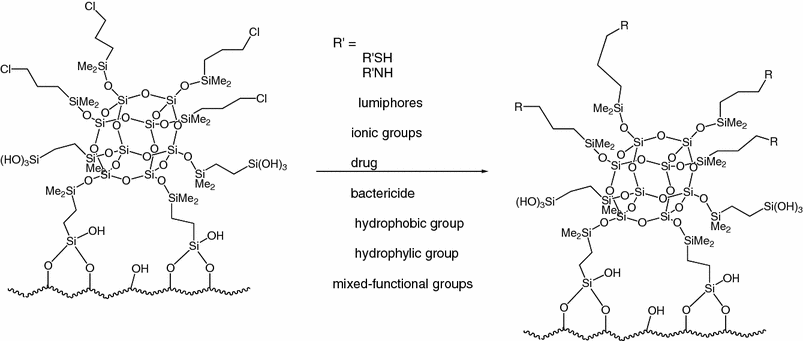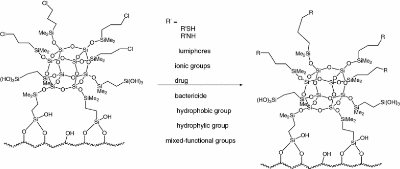 Researchers at Mayaterials recently developed (see Sect. 4) low-cost SQs prepared directly from an agricultural waste product, rice hull ash, that are bifunctionalized, with about four of each type of functional group. These bifunctional SQs offer the potential to: (1) serve as superior silanizing agents, (2) build layer-by-layer structures at nanometer length scales, (3) build graded property thin films and also (4) porous, high strength interlayer dielectrics; as a direct result of the Janus properties of these materials.