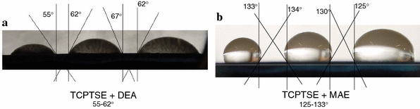 Contact angles for TCPTSE coated Al after reaction with (a) DEA and (b) MEA