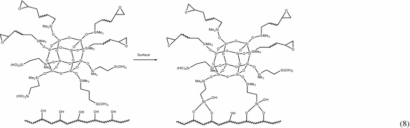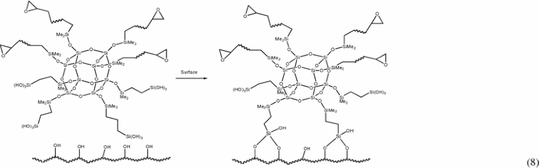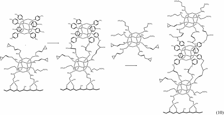 Reaction (10) below adds a second layer suggesting that the potential to make not only adhesive coatings on surfaces but also to create flexible layers by reversing the process. Thus it is possible to put epoxy layers on top of the first adhesive coating and then a coating of TGTSE on the amine layer and thereafter some quantity of hydrolyzed OTSE to create hard layers akin to those produced by Ro et al. [67] but without heating. These represent the potential commercial utility of these materials.
