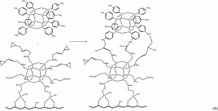 Silsesquioxanes provide access to epoxy nanocomposites with nearly complete definition (nm length scales) of all organic and inorganic components [37, 42, 43, 44, 47]. In turn, these nanocomposites provide structure–processing–property relationships that delineate the effects of changes in the organic component (tether) architectures on global mechanical properties [34, 35, 36, 37, 38, 39, 40, 41, 42, 43, 53]. For example, tailoring provides control of coefficients of thermal expansion of epoxy resin composites from 25 to 250 ppm/ °C [52]. Likewise, we were able to tailor O2 barrier properties to equal commercial systems (<1 cc · 20 μm/m2 · day · atm) and superior to polysiloxanes at 19,000 cc · 20 μm/m2 · day · atm) [53]. Moreover optimal values obtain from epoxy:amine ratios of 1:1 rather than the 1:2 stoichiometry used traditionally, pointing to the novelty of these materials [43, 44, 45, 51, 52].