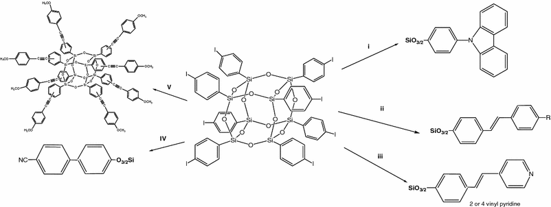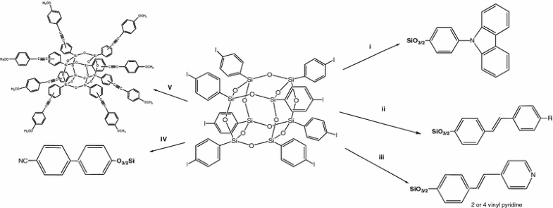 I8OPS derivatives (i) Cu2O/carbazole/150°C/1d. (ii) (Ph3P)4Pd/Zn(CN)2/120 °C/1d. (iii) RC2H/CuI/(Ph3P)4Pd/TEA/dioxane/60 °C/1d. (iv) BipyB(OH)3/(Ph3P)4Pd/PR3/120 °C/1d. v. (v) w/2-vinypy [45, 46, 64, Asuncion and Laine, Octaalkynylsilsesquioxanes, Sea Urchin Molecular connectors for 3-D-Nanostructures, "unpublished data"]