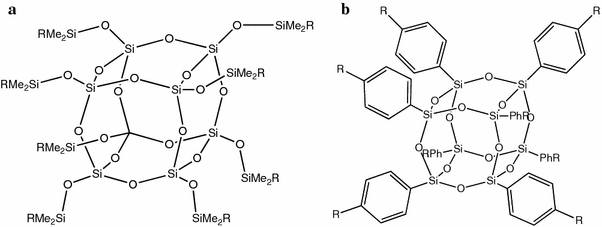 In the past decade, we have published more than 30 papers on octafunctional SQs and nanocomposites from them [32, 33, 34, 35, 36, 37, 38, 39, 40, 41]. We have developed routes to numerous octafunctional SQs (Fig. 1a) including mixed-substituent systems. Other researchers have made star polymers [25a], octaphenols [29], octaisocyanates [48], oligoethylene oxides [49], and liquid crystalline materials [50]. We also developed routes to nitro, amino, halo, alkyl, and aryl, OPS (RxOPS) (Fig. 1b) and the T12 SQs (RxPhSiO1.5)12 = RxDPS [39, 44, 45, 46, 51]. A brief overview of our work on structure-property relationships of nanocomposites and on the synthesis of star compounds is given in Sect. 2.