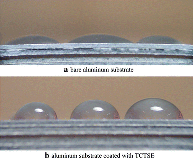 Three water droplets placed on uncoated and coated Al 7075 surface. (a) Bare aluminum substrate. (b) Aluminum substrate coated with TCTSE