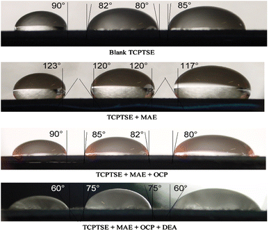 Contact angles for a series of coatings on Al made sequentially with TCPTSE, MAE, OCP, and DEA showing the changes in contact angles with each application. Only the first coating is sprayed on