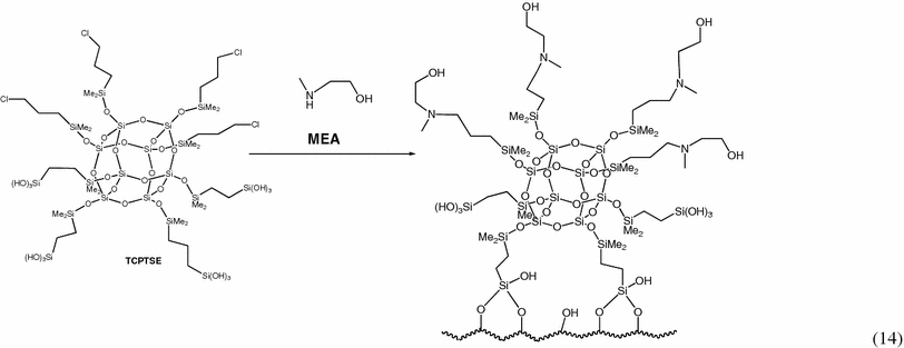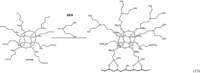 All solvents, allyl chloride, glycidoxyallylether, N-methylethanolamine, and diethanolamine, were purchased from Aldrich Inc. The solvents were distilled from drying agents under nitrogen prior to use. Vinyl triethoxysilane, was purchased from Gelest. Octahydridodimethylsilox octasilsesquioxane is produced commercially by Mayaterials and was recrystallized from hexane prior to use. Octaaminooctaphenyloctasilsesquioxane is a product of Mayaterials and was used as produced (>95% purity).