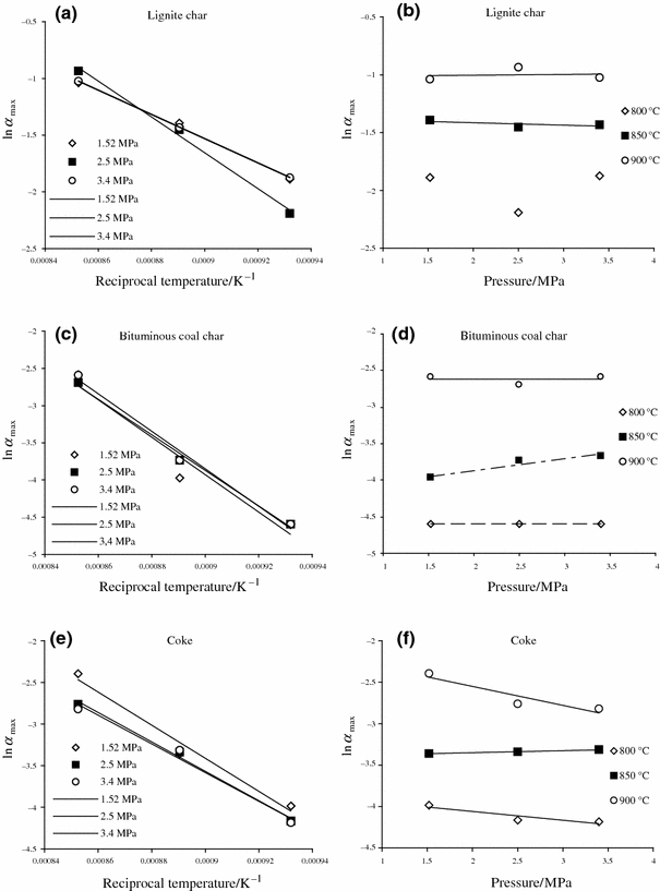 a, c, e Arrhenius relation (22) parameters determined for experiments performed at pressures of 1.52, 2.5 and 3.3 MPa for LigB char, hvCb char and coke, respectively; b, d, f Eyring model (29) fit to experimental data obtained at temperatures of 800, 850 and 900 °C for LigB char, hvCb char and coke