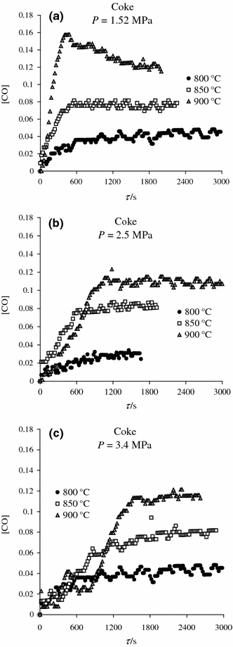Changes of CO content in the product gas during CO2 gasification of coke at different temperatures for pressures of 1.52 (a), 2.5 (b) and 3.4 MPa (c)