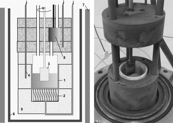 On the scheme presented on Fig. 3 alundum crucible (1) which has internal diameter around 35 mm and can contain aluminum bath of 50 g mass is shown. Mass of samples is 0.1–0.8 g that is minimal fraction of bath mass. Small change of degree of fulfillment of crucible during experiment is extremely crucial in calorimetric experiment. Directly under crucible bottom is presented thermopile (2) consisting of around forty series connected to each other thermocouples K type (NiAl–NiCr). It was used for measuring thermal effect accompanying dropping the sample into the bath. Alundum stirrer (3) is also presented in the Fig. 3. It results in obtaining a homogeneous composition of bath bulk, and accuracy of measurement is increased. Temperature of calorimetric block is measured with thermocouple K type (4). Main body of calorimetric block (5) shown in the Fig. 3 is made of heat-resisting steel. It is placed in heat-resisting steel container (6), this part is located inside calorimeter furnace (7) and is characterized by significant thermal inertia.