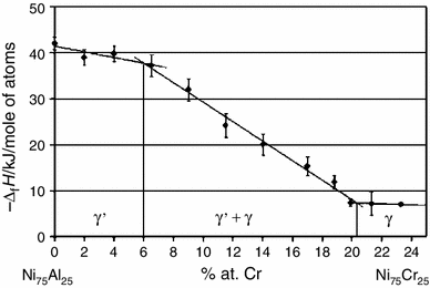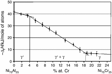 Based on significant breaks in the course of values of enthalpy as a function of Cr concentration authors claim that there are places of occurrence γ′ / γ′ + γ and γ′ + γ / γ phase boundaries. This is a new possibility in calorimetric technique.