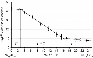 Course of formation enthalpy of alloys from Ni75Al25–Ni75Cr25 pseudo-binary as a function of chromium concentration at 1,150 K