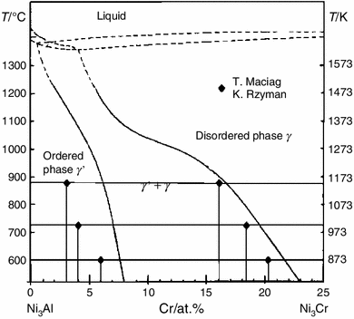 Pseudo-binary system Ni75Al25–Ni75Cr25 suggested by [7]. Points represent the locus of the phase boundaries obtained in the presented research