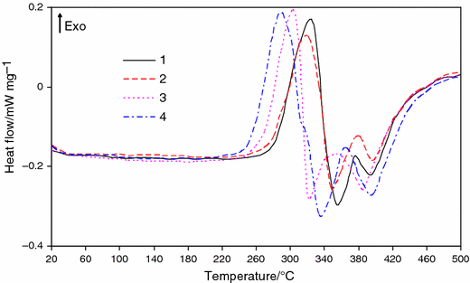 Differential scanning calorimetry analysis was performed with the use of a DSC 204 calorimeter, Netzsch (Germany). All DSC measurements were carried out in Al pans with pierced lid. As a reference empty Al crucible was applied. The mass of the sample was about 10 mg. The dynamic scans were performed at a heating rate of 10 °C min−1 from 20 to 500 °C under argon atmosphere (20 mL min−1).