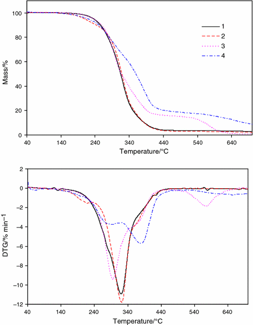 The gas composition evolved during heating process was analyzed by FT IR spectrometer Brucker TGA 585 (Germany) coupling on-line to STA instrument. The FTIR spectrometer with IR cell maintained at 200 °C was connected on-line to STA instrument by a Teflon transfer line with diameter of 2 mm heated to 200 °C. The FTIR spectra were recorded in the spectral range of 600–4,000 cm−1 with a resolution of 4 cm−1 and 16 scans per spectrum.