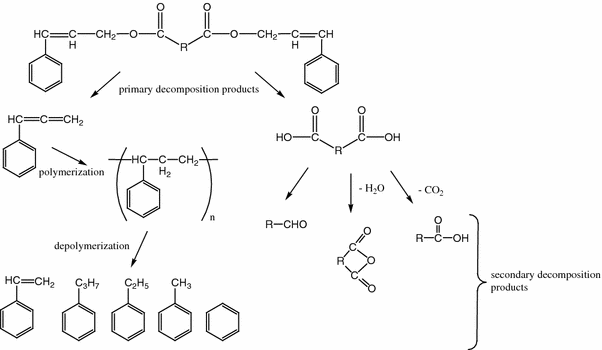 Studies on the pyrolysis of cyclo-aromatic diesters derivatives of 3-phenylprop-2-en-1-ol are presented. The diesters are obtained during catalyzed esterification process of a stoichiometric ratio of 3-phenylprop-2-en-1-ol with suitable cycloaliphatic or aromatic acid anhydride in the solvent-free medium. As an acid anhydrides cyclohexane-1,2-dicarboxylic anhydride, cis-4-cyclohexene-1,2-dicarboxylic anhydride, bicyclo[2.2.1]-5-heptene-2,3-dicarboxylic anhydride, and phthalic anhydride were applied. The thermal properties of obtained compounds under inert atmosphere were tested by means of differential scanning calorimetry and thermogravimetry coupled with FTIR analysis. The pyrolysis products were determined and the probable mechanism of their decomposition was proposed.