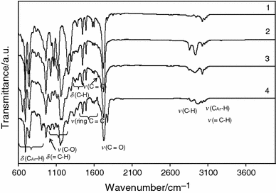 In addition, for all studied compounds, the bands attributed to the aliphatic fragments (stretching vibrations of C–H in –CH2– groups) at 2,860–2,923 cm−1 are observed. The presence of the stretching vibrations of =C–H and out-of-plane deformation vibrations of =C–H groups which appears as bands in the region of 660–900 cm−1 and as two bands at 3,029 and at 3,081 cm−1 characteristic for alkene is indicated. The absorption signals at 3,029–3,081 cm−1 and at 660–900 cm−1 may also be the result of the stretching vibrations of CAr–H and out-of-plane deformation vibrations of CAr–H. The presence of the stretching vibrations of C=C in phenyl rings at 1,440–1,598 cm−1 and in-plane deformation vibrations of aromatic =C–H groups for monosubstituted benzenes at 1,146–1,200 cm−1 also indicates the formation of aromatic compounds over the gases emitted during the first decomposition step.