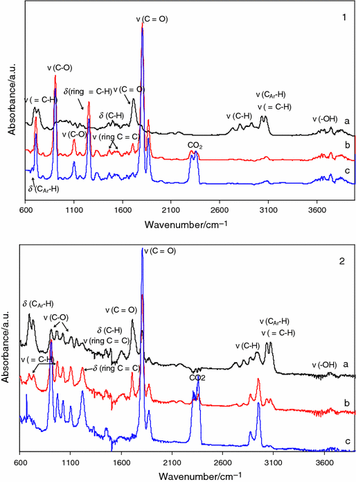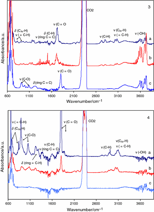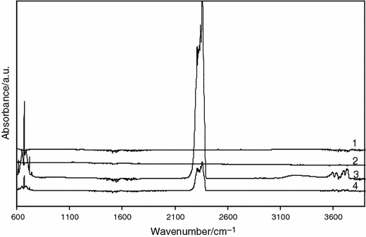 The FTIR spectra for all four cyclo-aromatic compounds exhibited bands characteristic for carbon dioxide at 670 cm−1 and 2,310–2,358 cm−1, carbon monooxide at 2,182 and 2,110 cm−1 and water or acids (the region of 3,600–3,700 cm−1) [29, 30, 31, 32].
