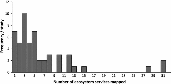 A fundamental requirement for adopting an ES approach to management is that a broad suite of ES are considered. The ability to map impacts of land use change on multiple ES simultaneously is a prerequisite for identification of synergies and trade-offs amongst them and hence for integrated planning. The extent to which the mapping approaches used in the 50 selected cases were able to accommodate requirements for integrated planning was assessed in terms of the types and number of ES mapped. The degree to which services were defined consistently across cases was also assessed because this has implications for comparative analysis (Haines-Young and Potschin 2011).
