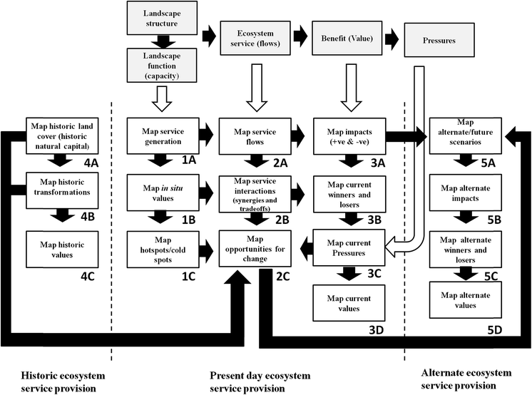 Provision of ES is dynamic through time as well as space, so that developing a spatially explicit understanding of trends in ES supply is required for their management. Mapping the impacts of historic land use change helps to explain variation in current ES supply and may help identify interventions to address shortfalls in delivery where reversion of land use change is appropriate. Mapping both historic land cover (node 4A) and historic transformations (node 4B) can provide valuable insight into both current and future ES delivery (see Reyers et al. 2009 for an example) and feed into identification of opportunities for interventions (node 2C). In a similar way, consideration of future drivers of land use change (e.g. the effects of climate change) or exploration of alternative scenarios for land use, requires development of future or alternate land use maps (node 5A), that can be used to inform models of ES flows. These can then be used to map potential impacts (node 5B) both in terms of winners and losers (node 5C).