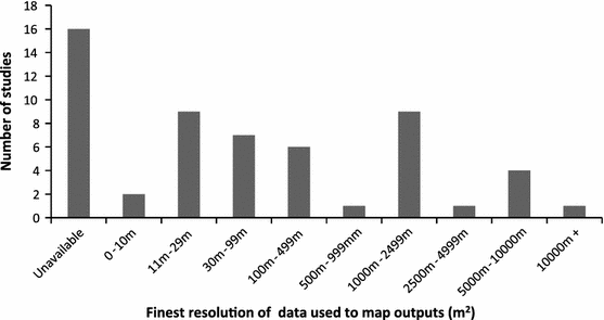 Land use datasets play a fundamental role in mapping ES. Resolution, refers to the amount of detail present in a dataset or map. Scientists have tended to use indicators, derived from land use or land cover as a proxy for the provision of ES (Marion 2009; Nelson et al. 2009). The ability to map, for example, tree cover in an area, may be used to infer water regulation. These relationships remain largely untested for most ES (Naidoo et al. 2008; Bennett et al. 2009). Despite this, mapping the areal extent and the position of these features, is fundamental for understanding their role in ES provision. The resolution of these data will have a significant impact on our ability to model ES provision. For example, datasets that identify individual trees and hedgerows, provide opportunities for much finer scale modelling of water flows than datasets that can only register large areas of woodland (Jackson et al. 2008). The evaluation of impacts of land use change on multiple ES simultaneously, requires integration of several spatially referenced datasets that may have different resolutions. In order to use maps in decision making the features have to be mapped at resolutions appropriate for the type of decision being made. Maps produced at national or regional scales may indicate where opportunities for changes in provision are required; but may offer only limited utility for ecosystem managers, who often require fine resolution information about how land use change will impact ES provision (Wynne-Jones 2013). The resolution of maps was assessed in our assessment by considering both the resolution of contributing datasets and that of the maps produced from them.