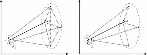Graphs constructed for GPFA (1) and GPFA (2) are illustrated on the left and right, respectively. Both pictures show a sample \(\mathbf {x}_t\) and its k nearest neighbors together with their successors in time (indicated through arrows). The distribution of the successors indicates that the first axis can be predicted with less uncertainty than the second axis. The dotted lines depict edges that are added to the graph according to the two variants of the algorithm. Edges for minimizing the variance of the past are constructed analogously