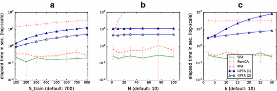 Figure 3 shows the predictability of the signals extracted by the different algorithms and how it varies in \(S_{train}\), N, and k. Only ForeCA and GPFA are able to distinguish the two components of predictable noise from the unpredictable ones, as can be seen from reaching a variance of about 1, which corresponds to the variance of the two generated, partly predictable components. As Fig. 3b shows, the performance of both versions of GPFA (as of all other algorithms) declines with a higher number of input dimensions (but for GPFA (2) less than for GPFA (1)). At this point, a larger number of training samples is necessary to produce more reliable results (experiments not shown). The results do not differ much with the choice of k though.