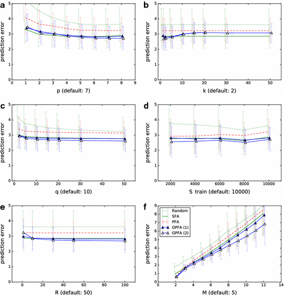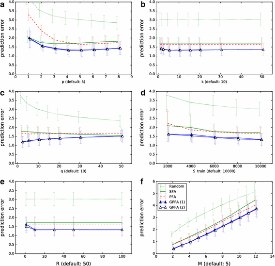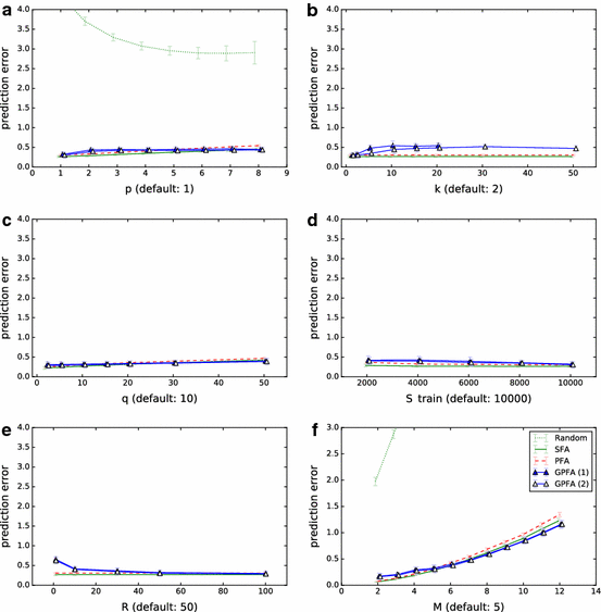 For all experiments, first the training set was whitened and then the same whitening transformation was applied to the test set. After training, the learned projection was used to extract the most predictable M-dimensional signal from the test set with each of the algorithms. The extracted signals were evaluated in terms of their empirical predictability (2). The neighborhood size used for this evaluation is called q in the following to distinguish it from the neighborhood size k used during the training of GPFA. Since there is no natural choice for the different evaluation functions that effectively result from different q, we arbitrarily chose \(q=10\) but also include plots on how results change with the value of q. The size of training and test set will be denoted by \(S_{train}\) and \(S_{test}\), respectively. The plots show mean and standard deviation for 50 repetitions of each experiment.5