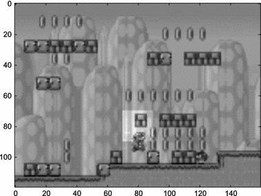 An example frame generated by a modified simulator from the Mario AI challenge. The highlighted square indicates the 400 pixels extracted for the experiment