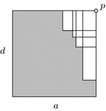Assume that \(\ \epsilon > 0 \ \) and that \(\ x > (5+\epsilon )^{6/7}\). Consider a collection \(\mathcal C\) of rectangles \(P_i\) of sides of length not greater than \(1\) with total area smaller than \(\ x^2 - (5+\epsilon ) x^{5/6}\). If \(\mathcal C\) is finite, then put \(\ {\mathcal R}={\mathcal C}\ \) and denote by \(z\) the number of rectangles in \(\mathcal R\). Otherwise, we can assume that \(\ area(P_1)\ge area(P_2) \ge \dots \). There is an integer \(z\) such that \(\ \sum _{i=z}^{\infty } area(P_i) < \frac{1}{2}\). By [5] we know that rectangles \(\ R_z, R_{z+1}, \dots \ \) can be packed into \(I_1\). Let \(\mathcal R\) be a collection of rectangles \(R_i\), where \(\ R_1 = I_1\ \) and \(\ R_i = P_{i-1}\ \) for \(\ i=2, \dots , z\).