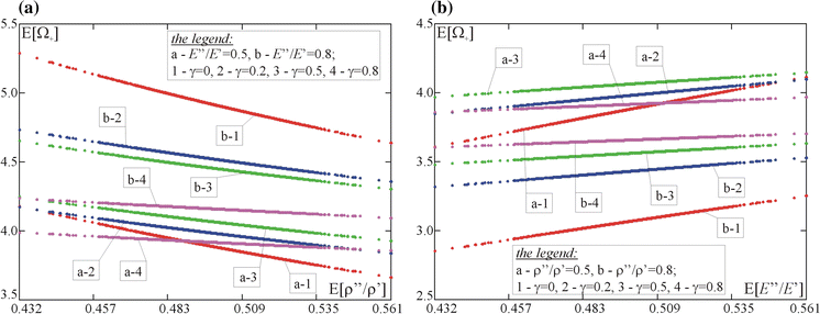 From Figs. 4, 5 and 6 it can be observed that plots of analyzed frequencies calculated from the tolerance and asymptotic models have identical values for random variables E″/E′ or ρ″/ρ′ (with their expected values equal 0.5 and parameter a = 0.02, 0.1) as for fixed ratios E″/E′ or ρ″/ρ′ (for their values from intervals [0.177,0.806] or [0.432,0.561]).
