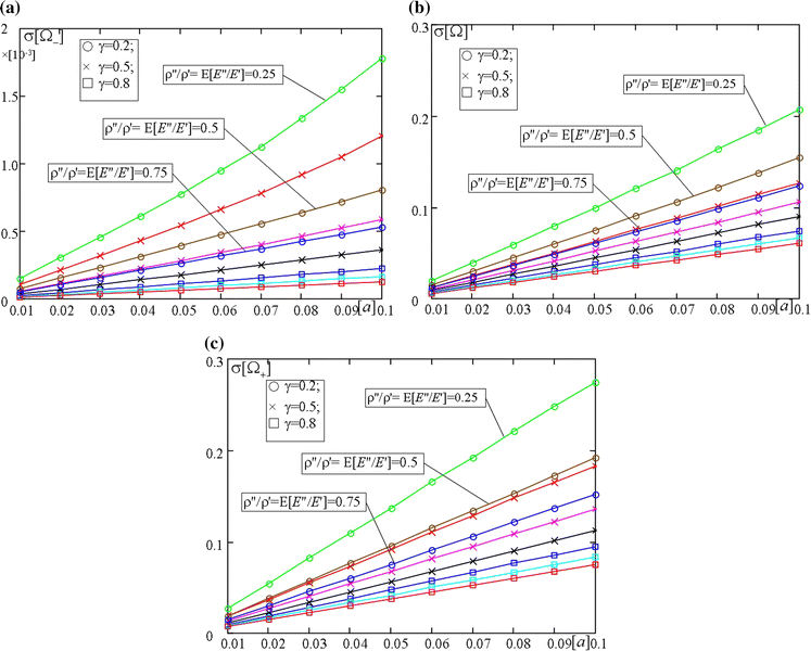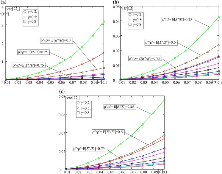 Plots of variances var(Ω) of frequency parameters versus a ∈ [0.01;0.1] (for ratio of Young’s modulus E[E″/E′] = 0.25;0.5;0.75; for parameter γ = 0.2;0.5;0.8; d/l = 0.1; l/L = 0.1): a lower frequency parameter Ω−; b frequency parameter Ω; c higher frequency parameter Ω+